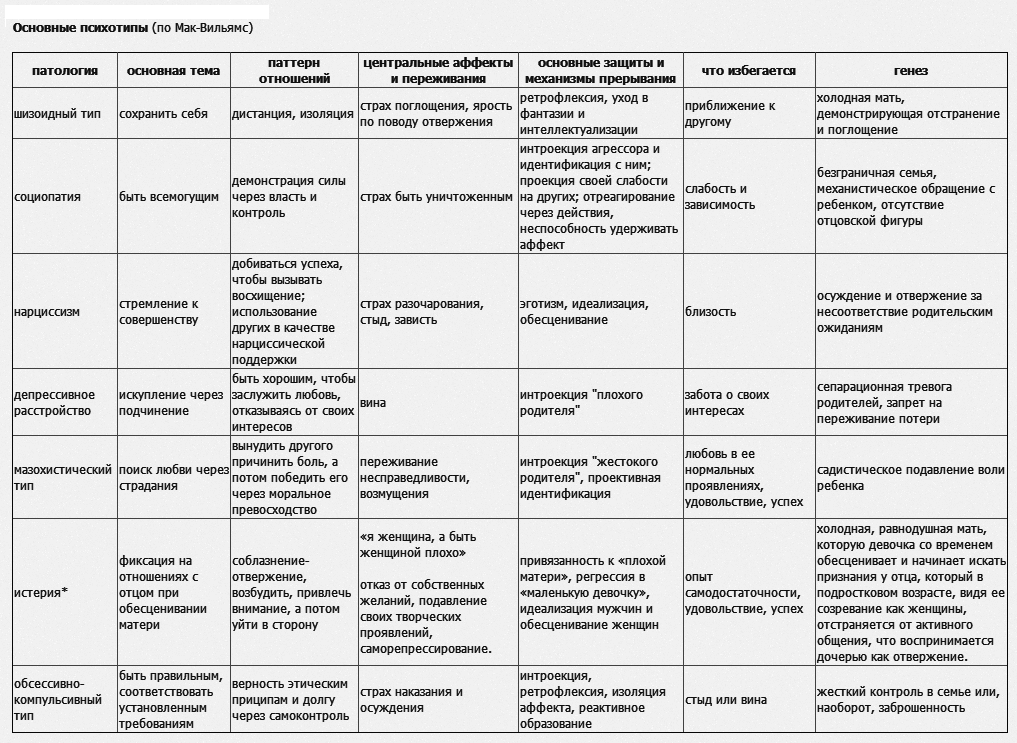 В таблице представлены типы личности по Нэнси Маквильямс.